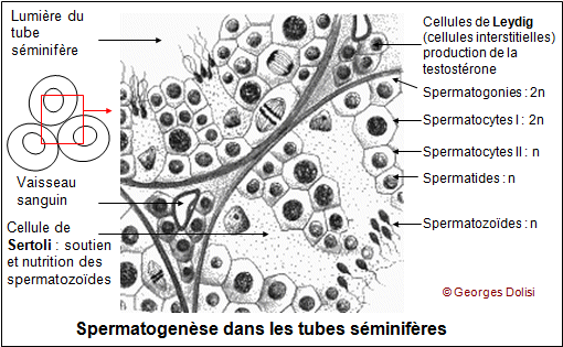 Les tubes séminifères sont séparés les uns des autres par les cellules de Leydig qui sécrètent les hormones sexuelles masculines.